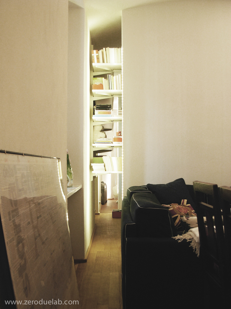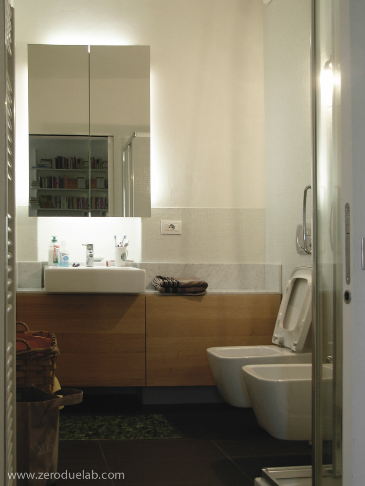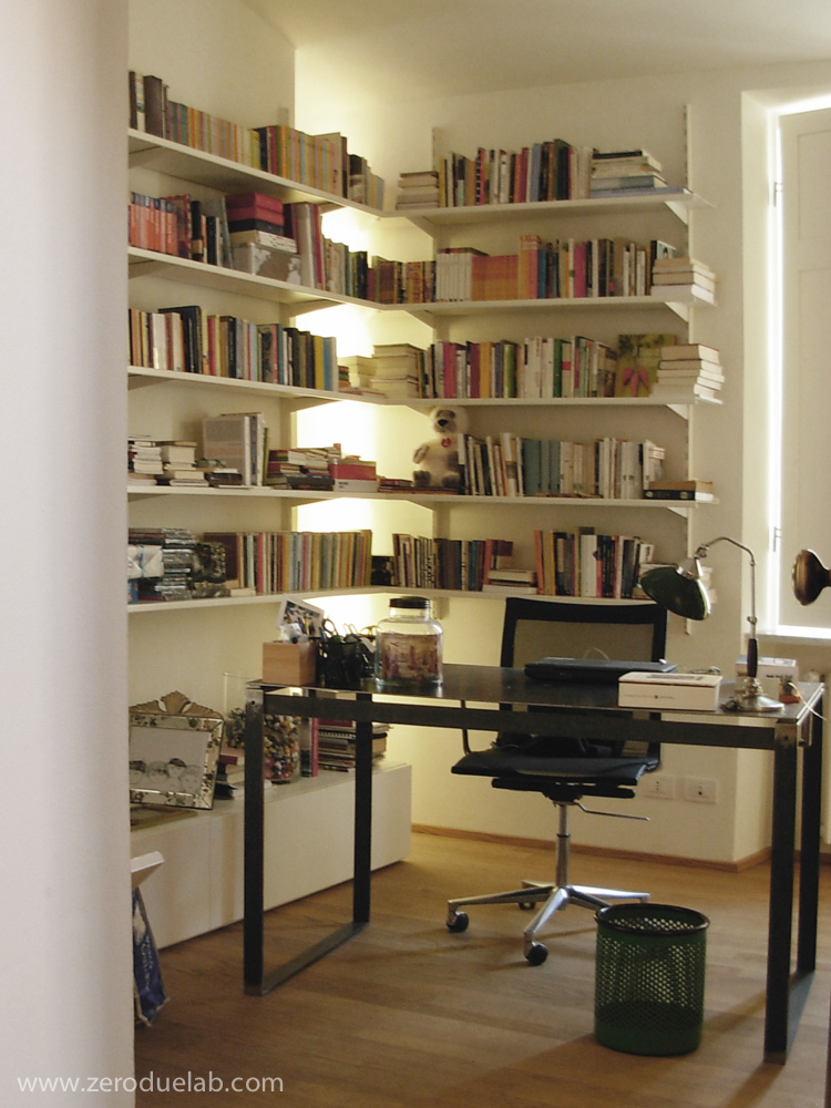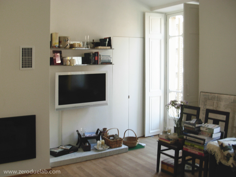 Contenitori su disegno incassati, pochi arredi di design e mobili di famiglia, il tutto subordinato all’idea di valorizzare lo spazio e la luce naturale proveniente dalla generose finestre dell’epoca.