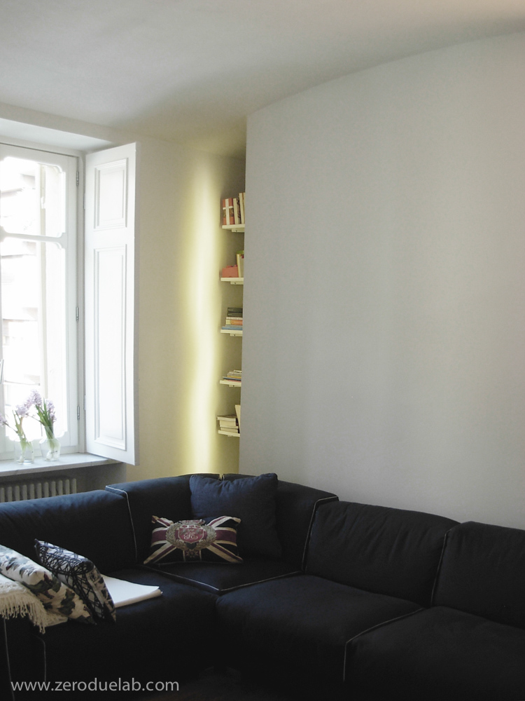 L’appartamento, oggetto di intervento di ristrutturazione, si colloca in un prestigioso palazzo d’epoca nel centro di Torino. La lunga manica caratterizzata dal soffitto a botte è stata liberata dai tramezzi realizzati negli anni ’70 che andavano a svilire la bellezza degli ambienti, sostituendoli con leggeri setti staccati dalle pareti laterali, in modo da poter leggere lo spazio longitudinale come un unicum.