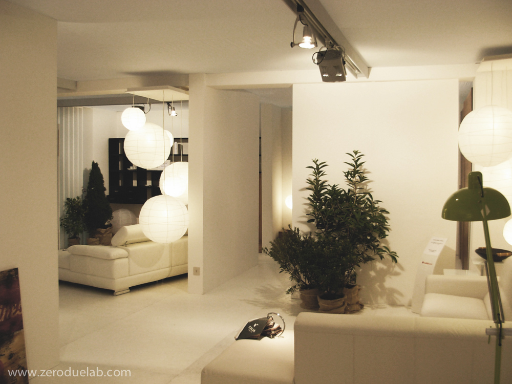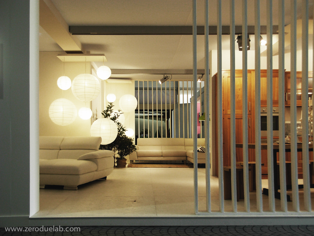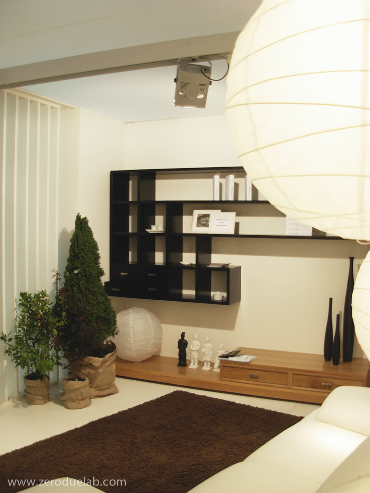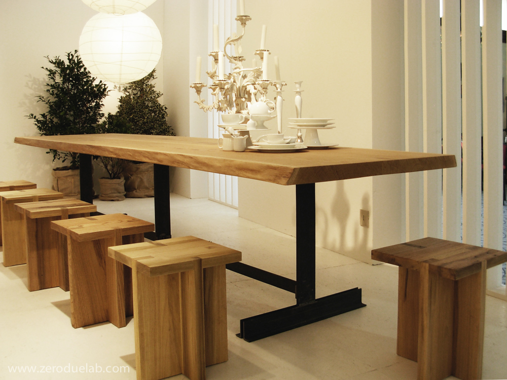 Allestimento stand espositivo dove il bianco dei pavimenti e delle pareti vuole mettere in evidenza gli elementi di arredo per cucine e soggiorni. Tavolo e sgabelli in legno di rovere, noce e acacia realizzati su misura.