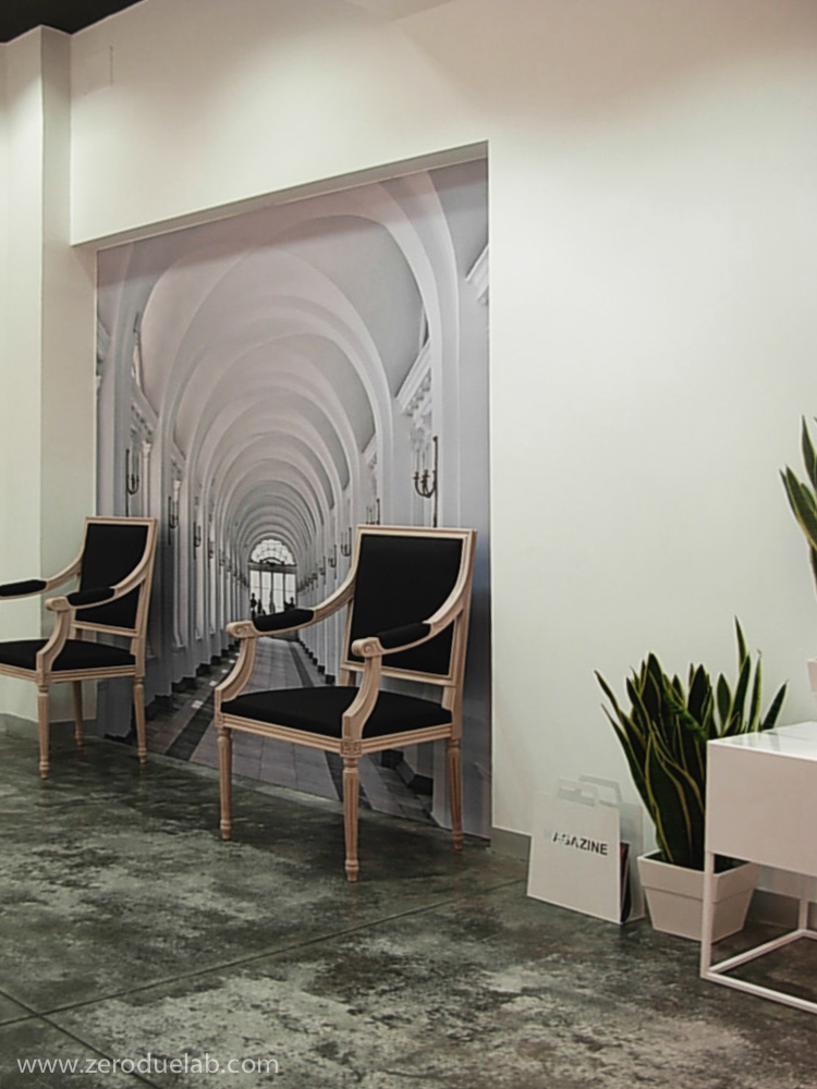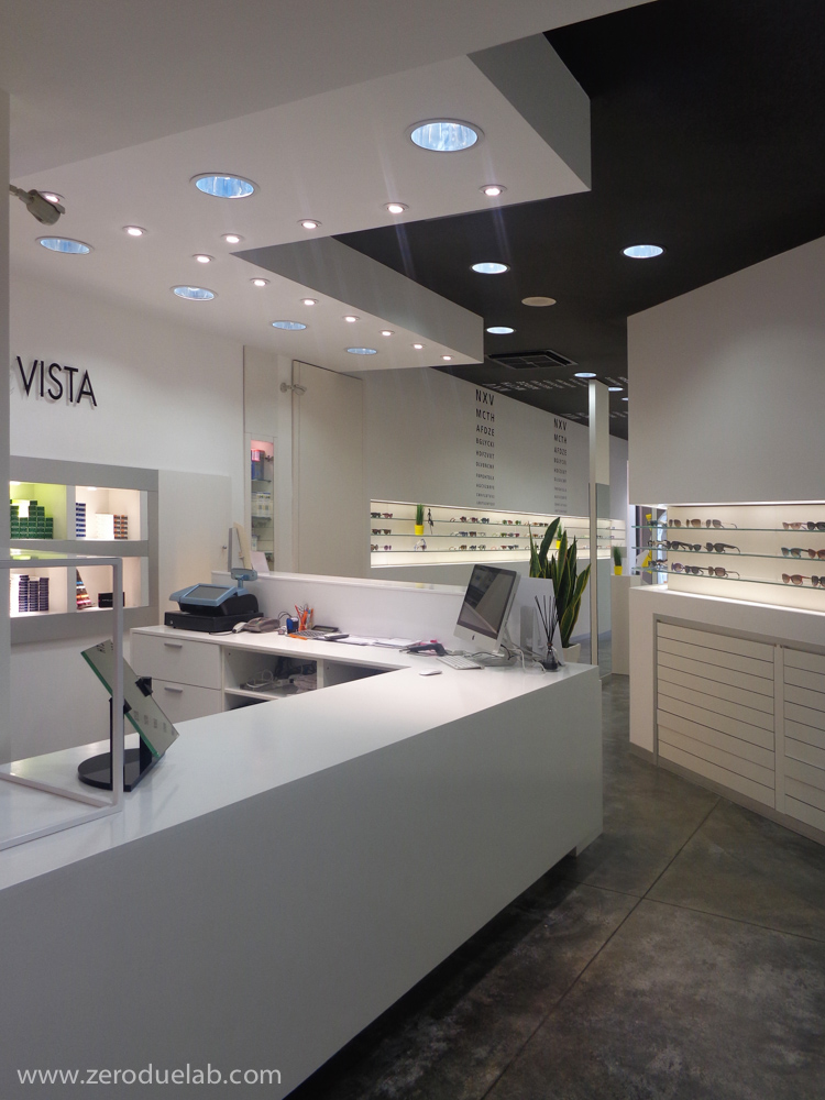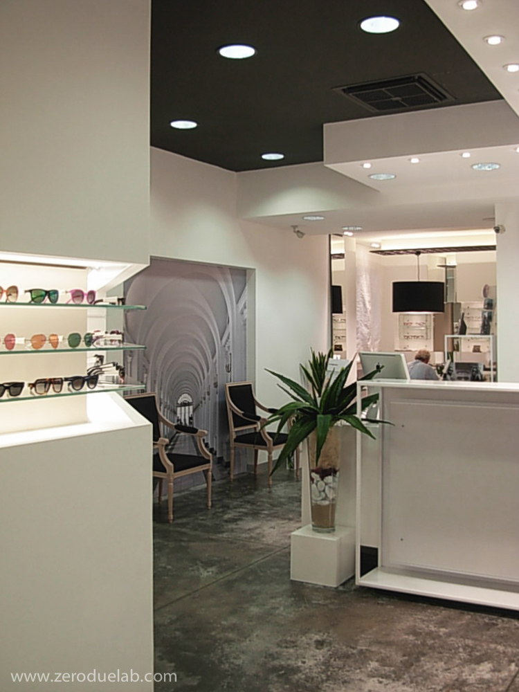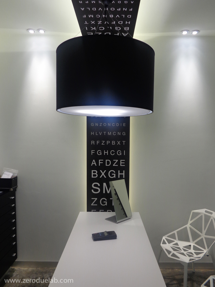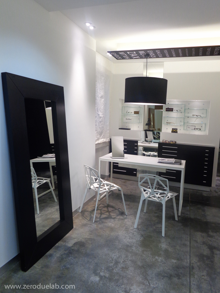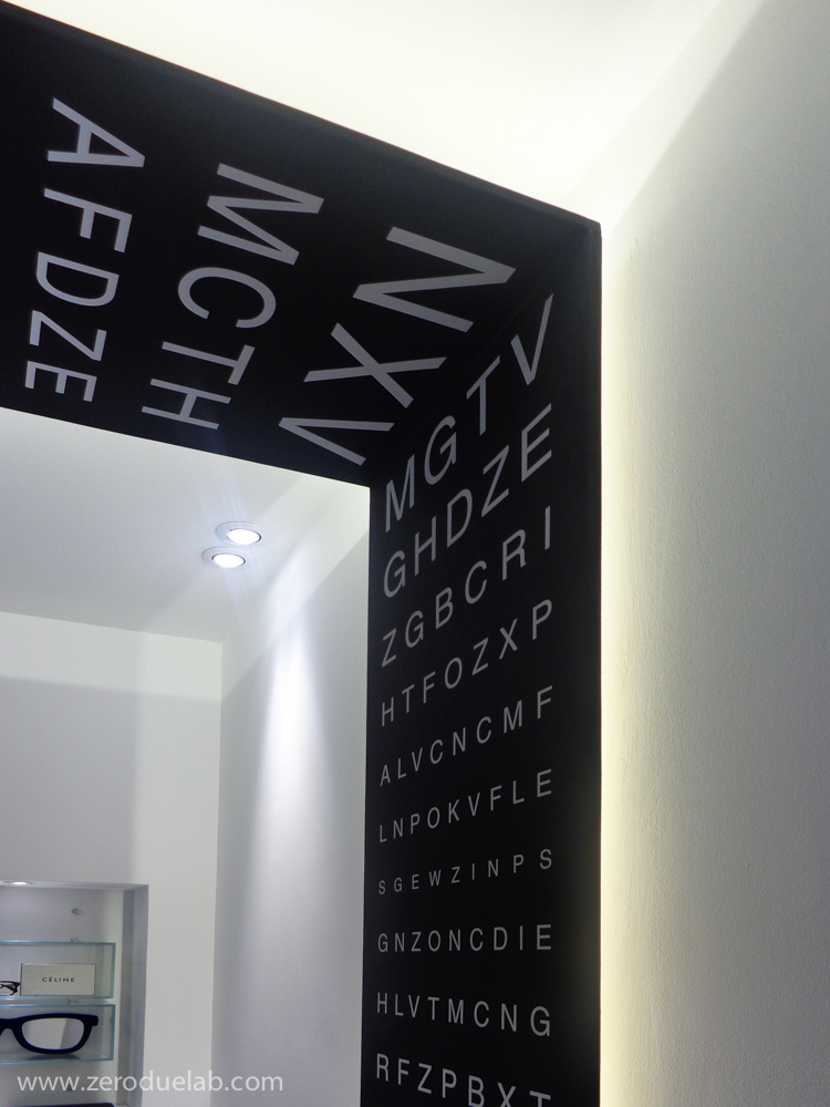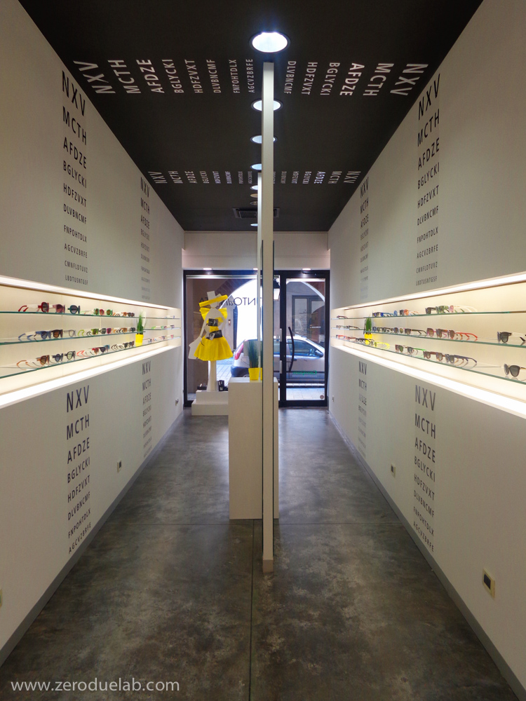 La scala optometrica è stata scelta come elemento decorativo di connotazione dell’unità commerciale, oggetto di intervento, sotto forma di pannello che parte da soffitto a scandire le zone funzionali del negozio. Il desiderio di slegarsi dagli arredi di produzione standard ha portato i committenti ad orientarsi verso un progetto globale, dove tutti gli elementi sono stati realizzati ad hoc per rispondere alle specifiche esigenze. Pavimento in cemento lisciato, pareti bianche e soffitto nero. Luci a led, vetro e specchio a dilatare gli spazi del locale situato nel centro storico con una planimetria a sviluppo longitudinale.